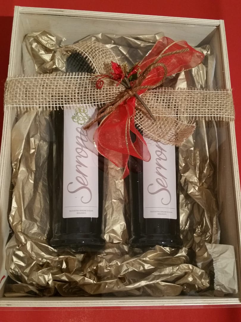 Cofanetto in legno composto da 2 bottiglie di Olio Extravergine biologico Serrone da 0,5 cl in confezione regalo